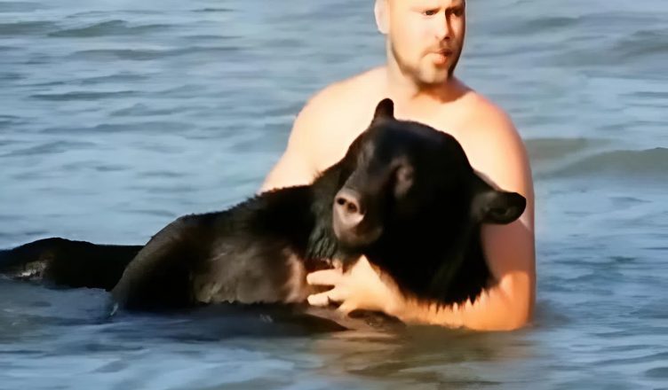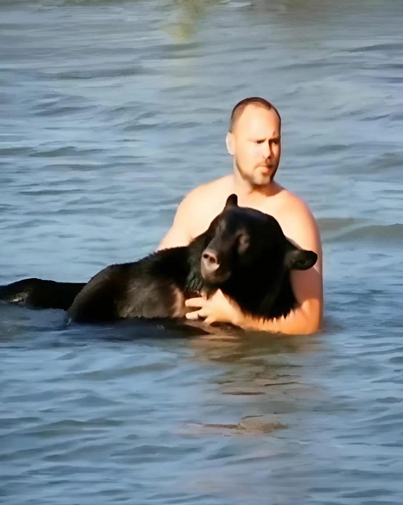It was an unbelievable sight: a man and a massive wild bear side by side in the open ocean. Waves crashed around them, but the man kept helping, carefully directing the animal toward the beach.