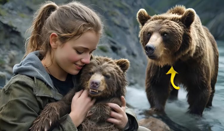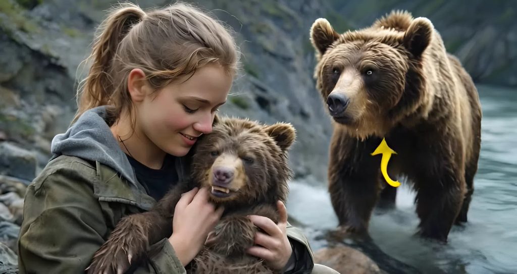 The bear approached, carefully lifting the cub with her mouth, as if afraid to hurt it. Then she looked at the girl.