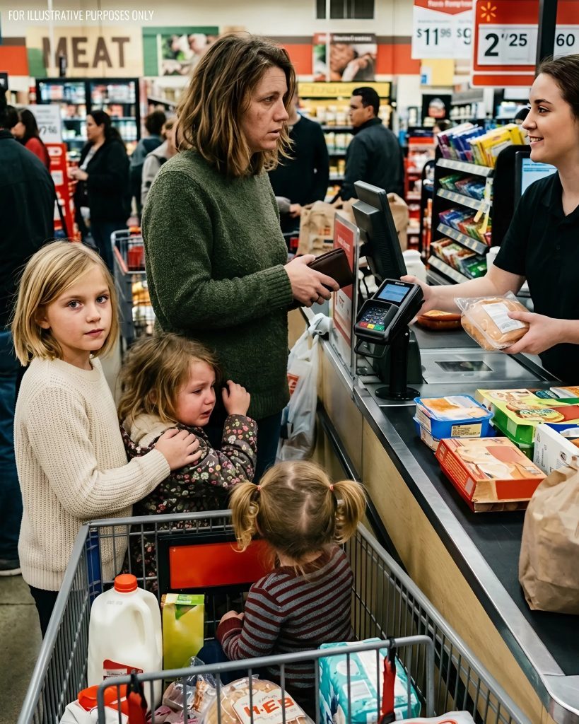 In front of me stood a woman with three children. One sat in the cart, another clung to her sleeve, and the oldest tried to act grown-up — but the fear in his eyes gave him away.
