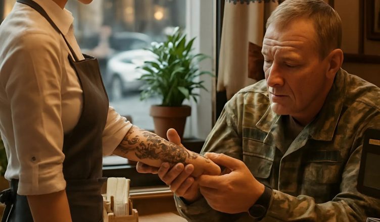 Veterán zbledl. Jeho ruka se zachvěla, hrnek se zatřásl. Ten znak znal — a nikdy na něj nezapomněl. Vstal, přistoupil k ní a prudce ji chytil za zápěstí.